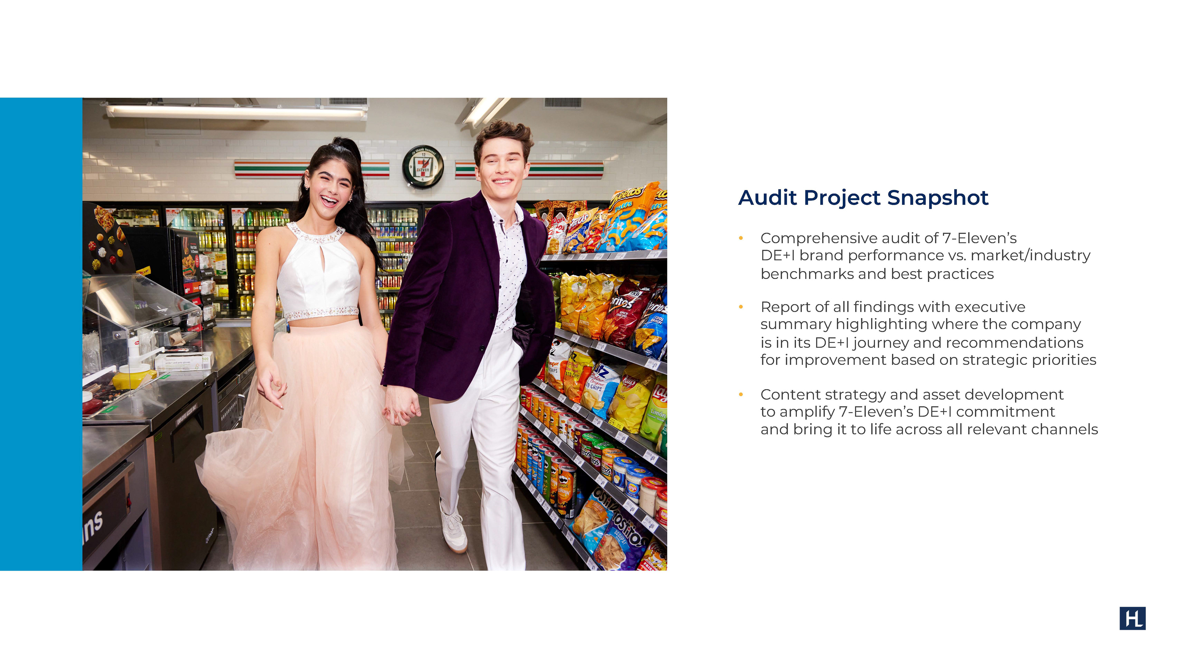 Slide deck designed for 7-Eleven's diversity marketing and inclusion benchmark audit, presented by HudsonLake, a B2B firm.