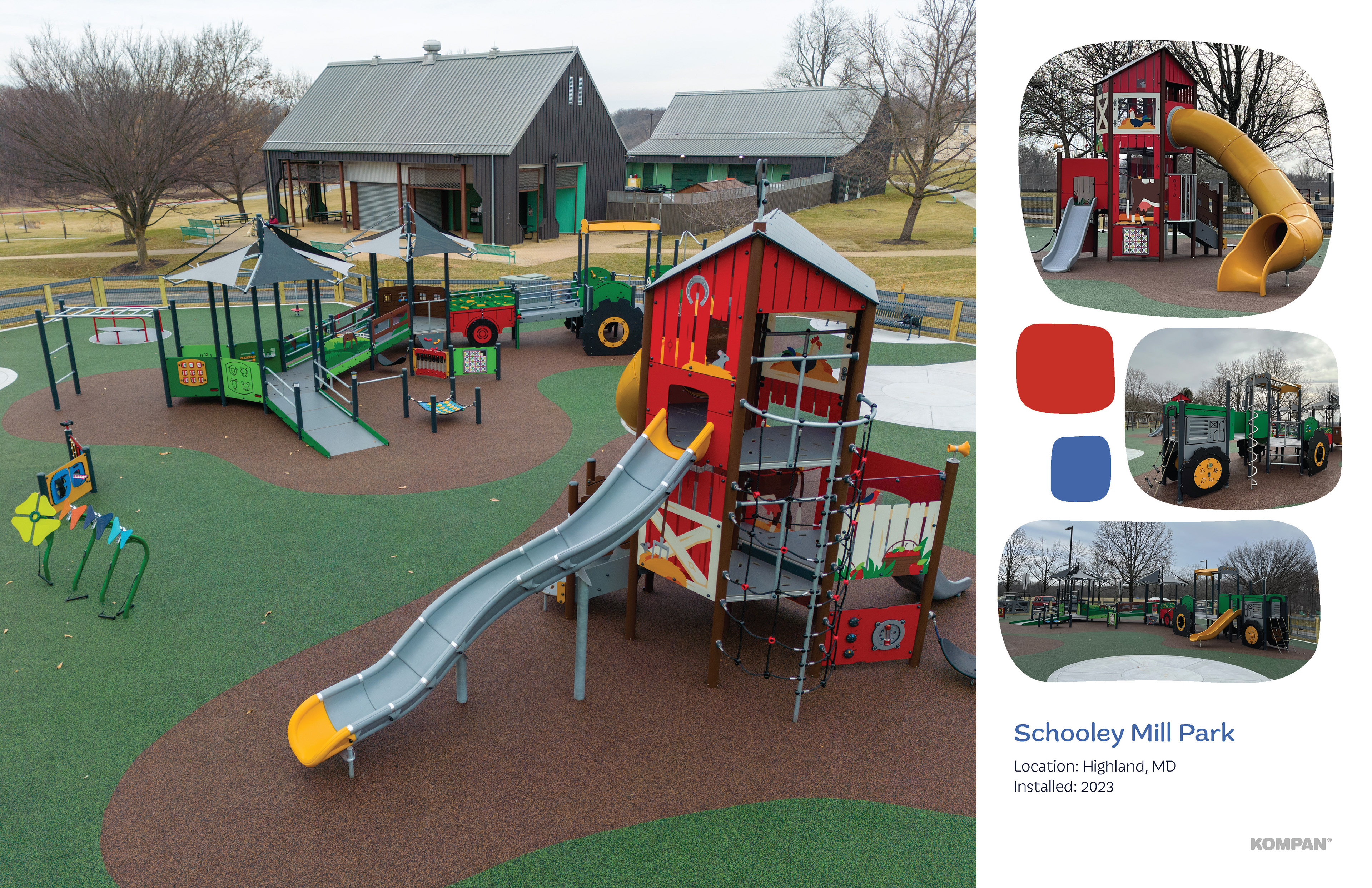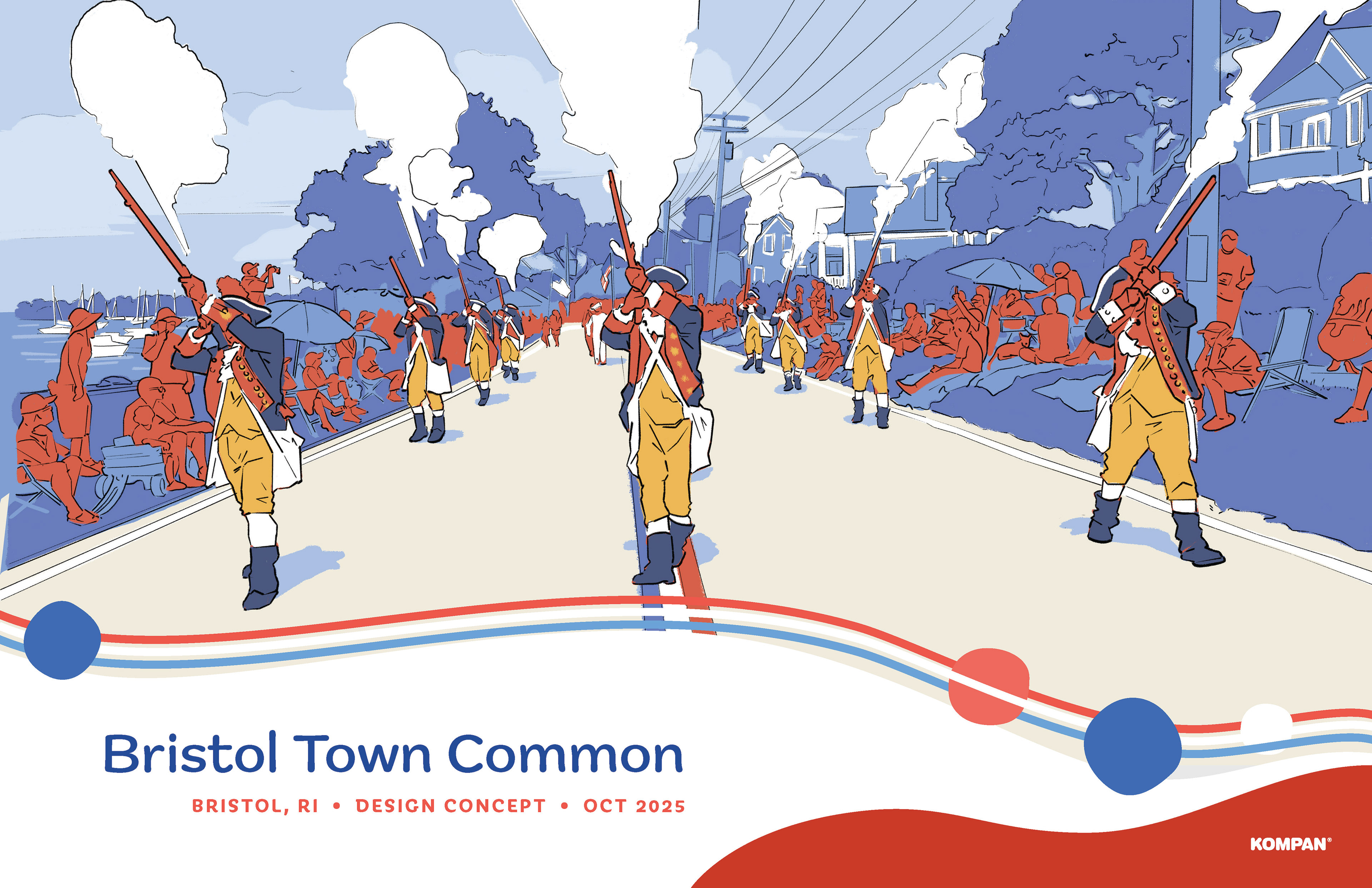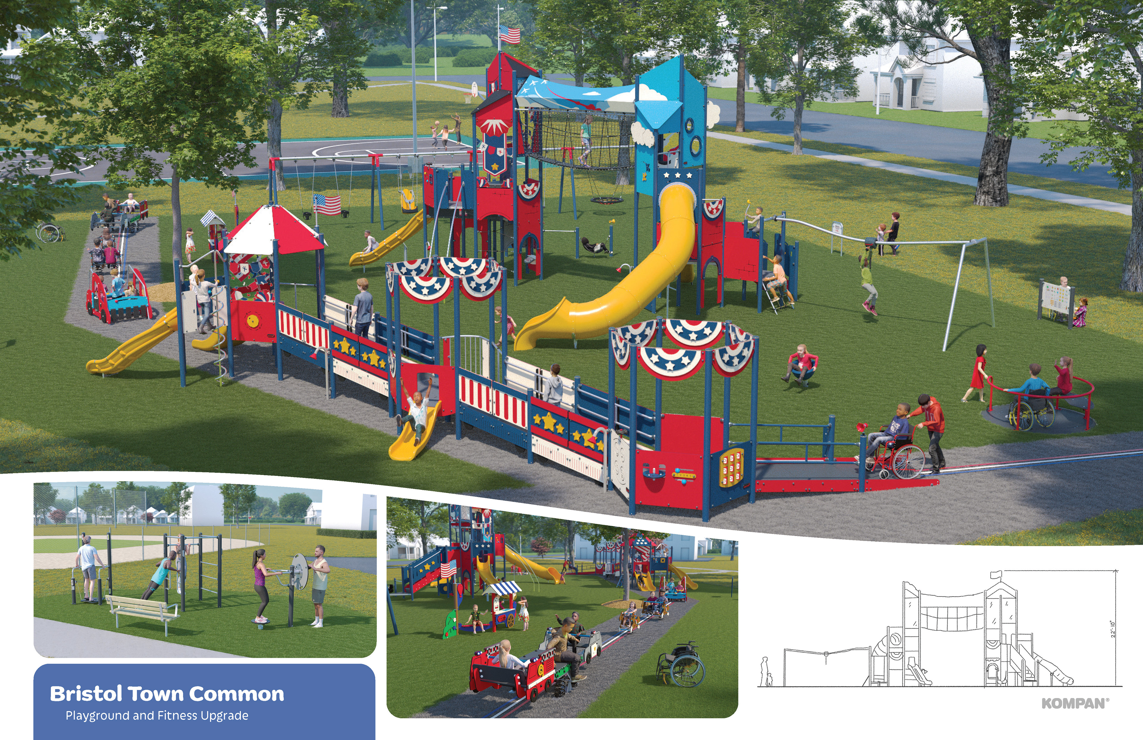 Kompan, Inc. is a commercial playground equipment manufacturer delivering cutting-edge outdoor fitness solutions, creating happier and healthier communities. This proposal pitch deck with for a bid for a community playground and fitness park in Bristol Town Commons, Massachusetts. The town has a claim-to-fame of the longest running Fourth of July celebration and parade in the nation, so the creative design was to fit the park into the red, white and blue stripes theme of the annual event.